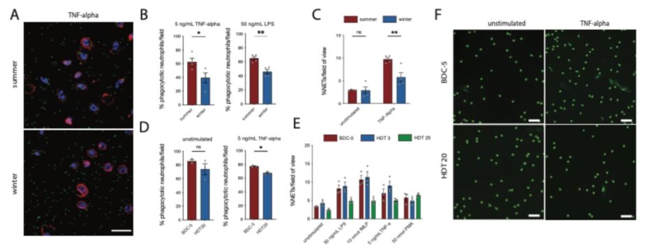 In 2024 we serially captured free ranging brown bears during hibernation and the following activity period as previously described. Isolated neutrophils showed functional alterations, with reduced phagocytic activity reflected by decreased uptake of fluorescently labelled E. coli particles during winter. This indicates an altered neutrophil function between long‑term immobility (Figure 2/A-B), as well as reduced formation of neutrophil extracellular traps (NETs) (Figure 2/C). Extending our initial approach, we assessed neutrophil function in human volunteers undergoing a bed rest protocol at the DLR in Cologne. The functional profile reflects that observed in long‑term immobilized hibernating brown bears, with neutrophils displaying reduced phagocytotic capacities (Figure 1/D) and decreased NET formation in-vitro (Figure 2/E-F).