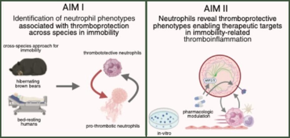 Cardiovascular diseases (CVDs), in particular myocardial infarction, stroke and venous thromboembolism (VTE), are the leading cause of morbidity and mortality worldwide, accounting for more than one third of all global deaths. Moreover, thrombotic events frequently and severely complicate a broad spectrum of clinical conditions that extend beyond the classical mechanisms of CVDs. Immobility and bed rest are among the strongest risk factors for VTE with increasing relevance in an aging population. Our previous study has demonstrated a naturally occurring thromboprotective phenotype in hibernating brown bears, bed-resting individuals, and SCI patients.1 This project examines neutrophils as central drivers of a thromboprotective phenotype during prolonged immobilization, employing a cross-species comparative approach that integrates hibernating brown bears and bed-resting human subjects. The overarching aim is to delineate thromboprotective signatures of neutrophils in long-term immobility, thereby uncovering neutrophil-intrinsic pathways that perpetuate thromboinflammatory responses. Building on these characterizations, we will establish the mechanistic foundation for identifying novel therapeutic targets in neutrophil-driven thromboinflammation.