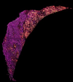 Figure 1. Imaging mass cytometry staining of a liver sample stained with antibodies directed against fatty acid synthase (magenta), voltage-dependent anion-channel 1 (green) and CD44 (red).